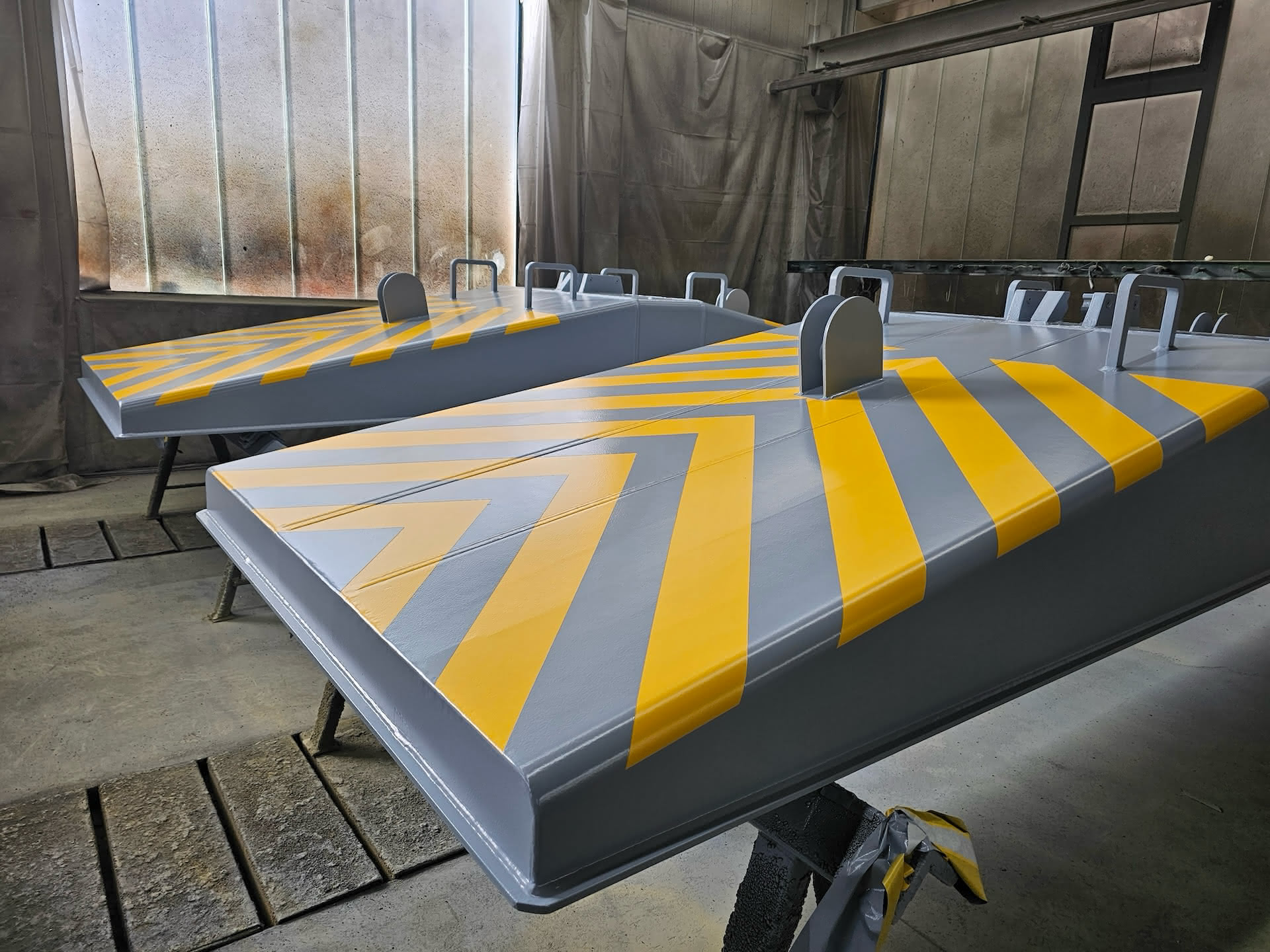 In Kooperation mit Liebherr beschaffen wir das Material, verschweißen die Einzelteile mit größter Genauigkeit und beschichten das Produkt. Eine eigens entwickelte Vorrichtung und der Einsatz eines modernen Schweißroboters spiegeln unseren Anspruch an Innovation, Qualität und Effizienz wider. Für maximale Stabilität konstruieren wir die Platten mit Vorspannung: Im unbelasteten Zustand leicht hochgewölbt, liegen sie unter Last plan und sicher auf dem Boden. Ergänzt werden sie durch die von Liebherr beigestellten Kugelpfannen.