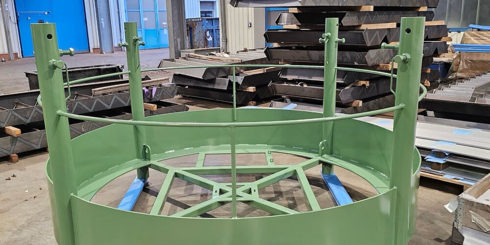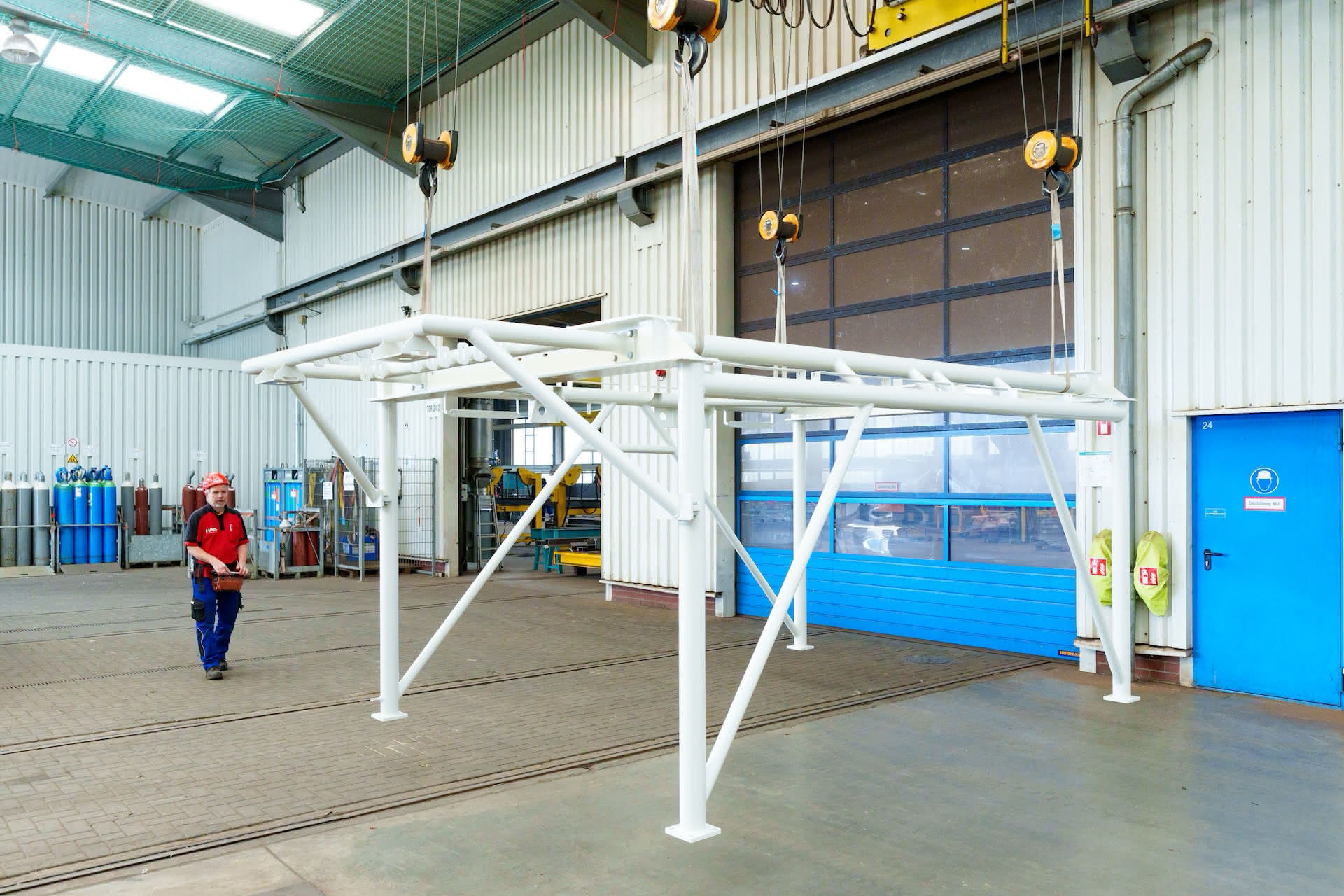 Nach Zeichnungen von Liebherr beschaffen wir das Material, kaufen den Rohrzuschnitt ein und schweißen die Einzelteile zusammen. Die Herausforderung besteht darin, dass es sich nicht um gerade Flächen handelt. Der Schweißbrenner muss in verschiedenen Positionen geführt werden, was unsere Experten mit Erfahrung, Können und einer Extraportion Leidenschaft meistern. Anschließend beschichten wir die Konstruktionen. Für Wiederholungsgenauigkeit und Effizienz haben wir eigens für diesen Auftrag eine Produktionsvorrichtung konstruiert.
