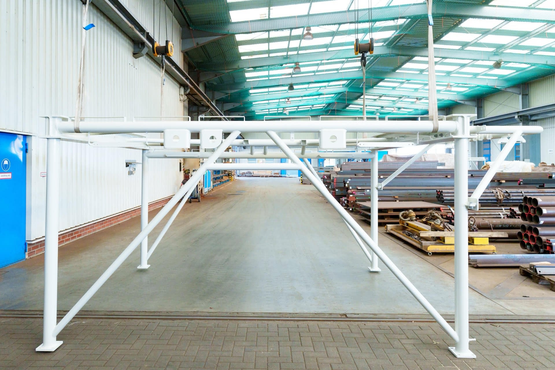 Die LHM-Hafenmobilkrane der Typen 180-800 von Liebherr-Rostock GmbH sind weltweit im Einsatz. Diese Hebe-Giganten arbeiten mit starken Motoren, die gekühlt werden müssen. Damit die Kühleraggregate sicher befestigt sind, benötigt das Unternehmen Grundgestelle als Rohrfachwerkkonstruktion und beauftragte uns mit der Serienfertigung von 80 Stück. Dieser Auftrag freute uns besonders, da er weitere gemeinsame Projekte mit dem renommierten Kran-Spezialisten einläutete.