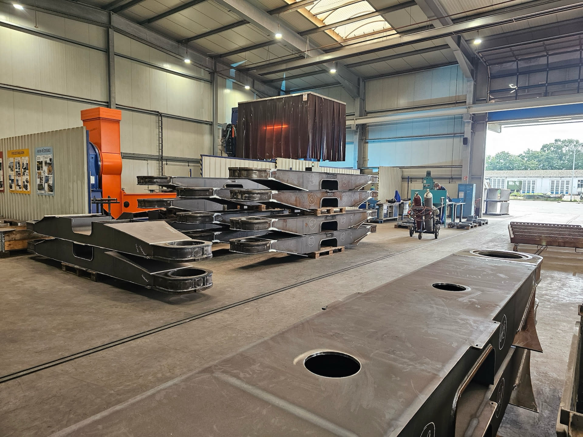 Die LHM-Hafenmobilkrane von Liebherr kommen weltweit insbesondere im Schüttgutumschlag zum Einsatz. Dafür beauftragte uns das Unternehmen mit der Fertigung von insgesamt 400 Radachsen. Das von uns beschaffte Material schneiden wir zu und schweißen es nach Kundenzeichnung von Hand. Um gleichbleibende Qualität und Effizienz sicherzustellen, fertigen wir in einer speziell entwickelten Vorrichtung, die exakt auf diese Serie abgestimmt ist.
