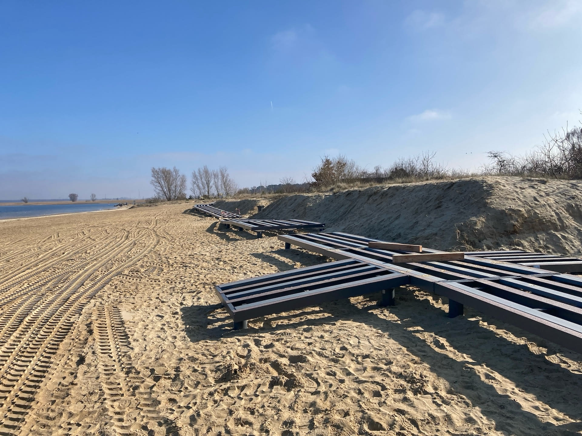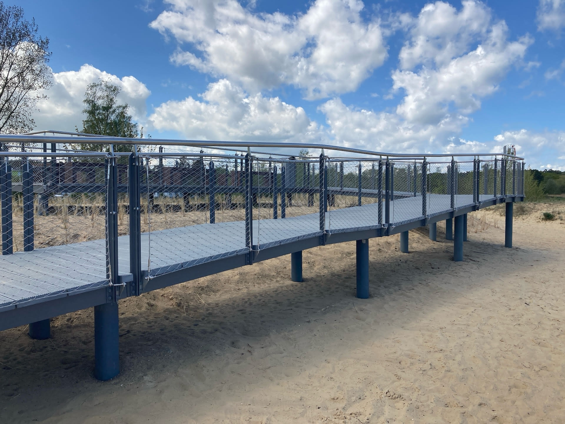 Die Anlage besteht aus robusten Stahlträgern, einem landseitigen Geländer mit Edelstahlhandlauf und Drahtseilen sowie einer begehbaren Fläche aus TRIMAX®-Belag. Die besondere Herausforderung lag in der unregelmäßigen Dünenlinie, der der Steg folgt. Mit Rampen wurden die Höhenunterschiede (auch zur Aussichtsplattform) ausgeglichen. So entstand eine durchdachte und belastbare Konstruktion, die sich harmonisch in die Landschaft einfügt. Mit unserer Erfahrung im Stahlwasserbau, präziser Planung und zuverlässiger Umsetzung ist auch hier eine Lösung entstanden, die Funktion, Sicherheit und Langlebigkeit verbindet.